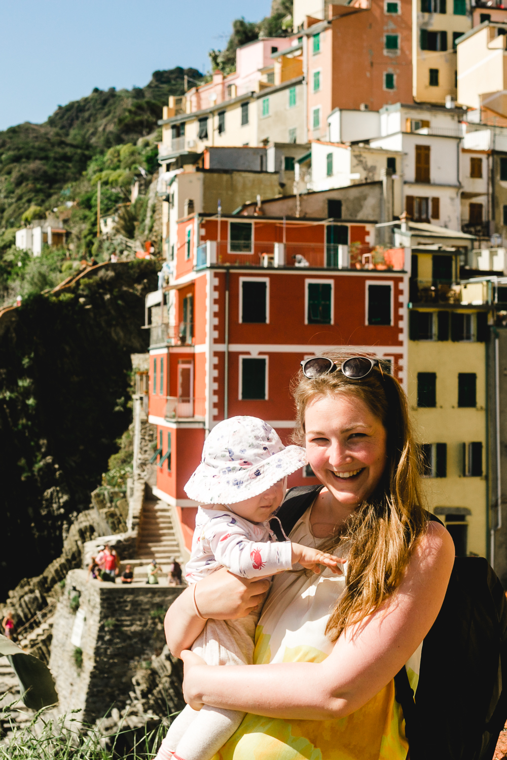 Mir wurde bei der Planung gleich bewusst, dass das mit dem Mietwagen nichts wird. Doch wie kommt man denn nun mit dem Baby dahin? Natürlich mit dem Zug, ist doch klar. Denn es wurde extra eine Bahnstrecke gebaut, um alle Orte zu verbinden und mit dem riesigen Touristenandrang (da kann ich schon einmal vorgreifen: es waren wirklich viele Menschen) umgehen zu können. Also buchte ich 2 Tickets (Hin-und Rückfahrt kosten lächerliche 18 Euro pro Person, warum sollte man da mit dem Auto fahren? 😉 ) Marlena durfte natürlich umsonst fahren und wir machten uns morgens mit dem Auto auf den Weg zum Nachbarort Rapallo, um von dort dann mit dem Zug das erste Örtchen Monterosso anzusteuern. Die Zugfahrt führt die ganze Zeit direkt am Meer entlang und man kann sich die 30 Minuten super mit Aus-dem-Fenster-schauen vertreiben.