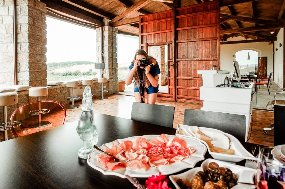 Nach dem theoretischen Teil erwartete uns natürlich die Praxis. Wir verkosteten vier Weine und bekamen unglaublich leckeres Essen dazu serviert. Chiara erzählte uns viel über Sardinien, über die Lebensmittel, Tenute Olbios und ließ sich von uns mit Fragen löchern. Es war absolut entspannt und lustig und wurde natürlich mit jedem Gläschen immer lustiger (wahrscheinlich vor allem für Chiara, die ja nüchtern blieb 😀 ). Sie servierte uns verschiedene Käse- und Wurstsorten und weitere Antipasti. Ich habe keine Ahnung, wohin wir das alles gegessen haben. Dabei haben wir die ganze Zeit den Wahnsinnsausblick genossen, denn die Räumlichkeiten sind fast komplett verglast und architektonisch eine tolle Mischung aus Alt und Neu.
