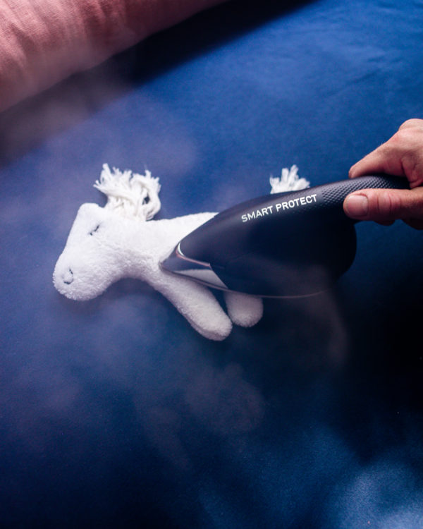 Deshalb waren wir ganz aufgeregt, als Tefal uns fragten, ob wir den Tefal CUBE testen möchten. Ich bin ehrlich. Ich hab erst nicht so ganz verstanden, was der Sinn vom Tefal CUBE ist. Doch als wir ihn dann ausprobiert haben und ich seine Multifunktionalität entdeckt habe, war ich total begeistert. Denn dieser blaue Würfel kann gleichzeitig bügeln und steamen, aber auch desinfizieren und hygienisch reinigen direkt am Einsatzort. Ihr müsst die Vorhänge also nicht abnehmen und zur Waschmaschine tragen, dann wieder rausnehmen und aufhängen. Nein, einfach vor Ort mit dem Tefal Cube reinigen.